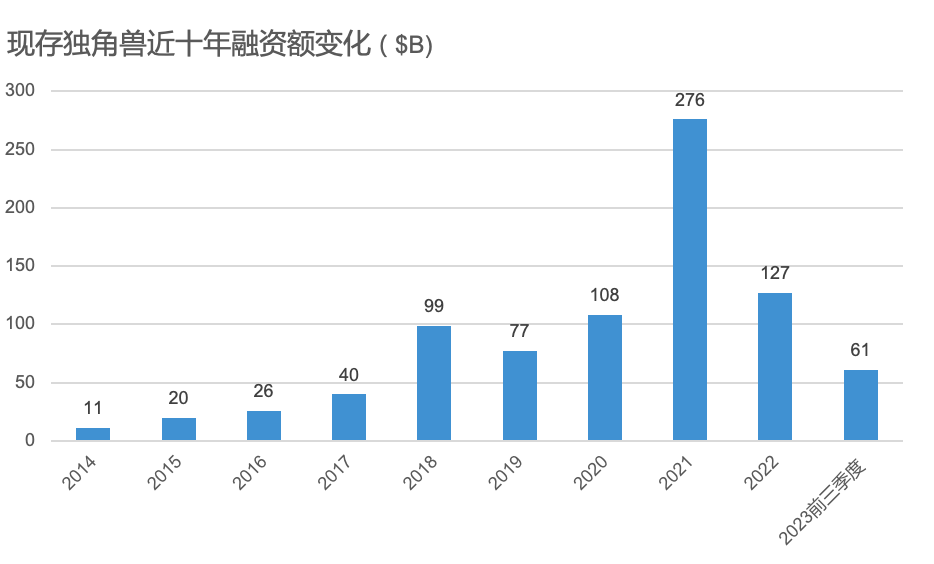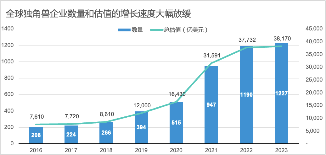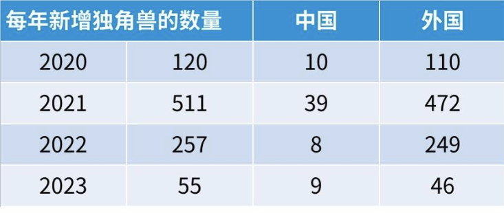 很多人可能对这一现象已经习以为常,但事实上走到今天并不容易。新冠疫情开始后的三年,是独角兽历史上最活跃的三年,全球几乎平均每天都在诞生一家新的独角兽企业。这一风潮在2022年中戛然而止。由于美国加息以及全球经济增速下滑带来的不确定性,风投市场降温,2023年独角兽的增长更是创下了近年来的新低。