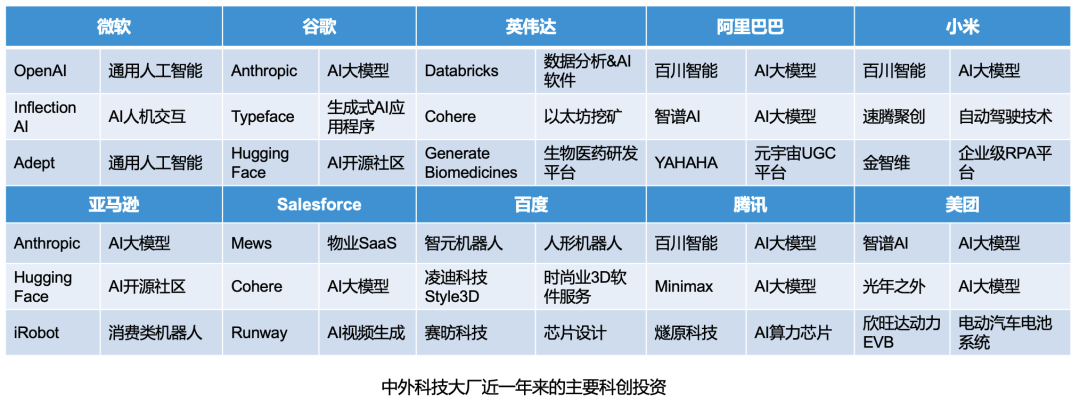 纵观全球,2023年科技巨头在对外投资和孵化初创企业方面收获颇丰。无论微软、谷歌、英伟达、亚马逊、Salesforce等海外巨头,还是BAT、小米、美团等国内大厂。这也是行业龙头丰富自身商业生态的独特优势所在,而且这一趋势会延续。