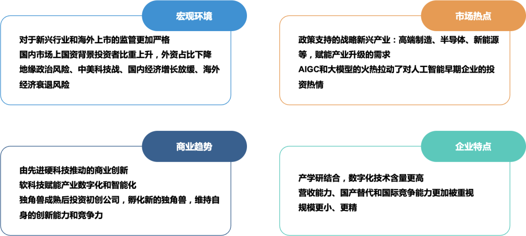 一方面,对新兴行业和海外上市的监管趋于严格;另一方面,国内市场的国资背景投资者比重上升、外资占比下降;除此以外,地缘政治风险、中美科技战、国内经济增长放缓、海外经济衰退风险等因素叠加更是增加不确定性。
