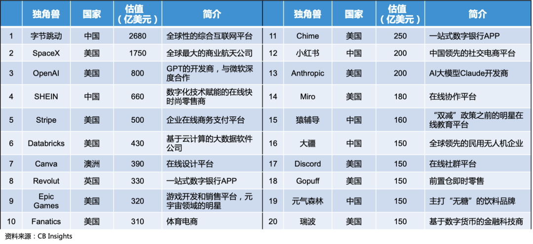 2023年全球估值最高的独角兽Top20