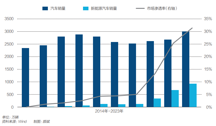 Wind数据显示,2014年,中国新能源汽车销量仅为2.2万辆,市场渗透率0.09%,但到了2023年,新能源汽车渗透率达31.5%,在10年的时间里得到显著大幅提升。