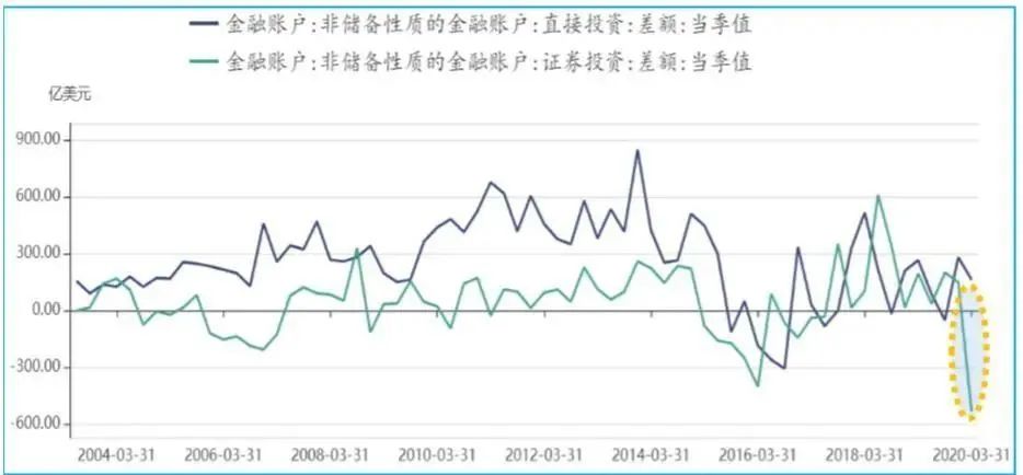 截至2020年1季度,非储备性质金融账户逆差(流出)139亿美元——其中直接投资顺差163亿美元,证券投资逆差532亿美元。