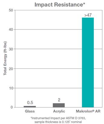 聚碳酸酯的冲击强度大约是玻璃的100倍,同时遇到外力冲击超过受力极限时不会产生飞溅。同时同等厚度和体积的聚碳酸酯比玻璃轻一半以上(聚碳酸酯的密度仅为1.2kg/m³, 玻璃为2.5kg/m³)。因此在安全防爆领域和轻量化设计方面, 聚碳酸酯取代玻璃的应用越来越多。