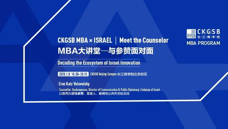 2020年是中以建交25周年,在这个时点上,长江商学院英文MBA项目将于2020年1月8日联合以色列驻华使馆举办新年首场“MBA大讲堂——与参赞面对面”活动。