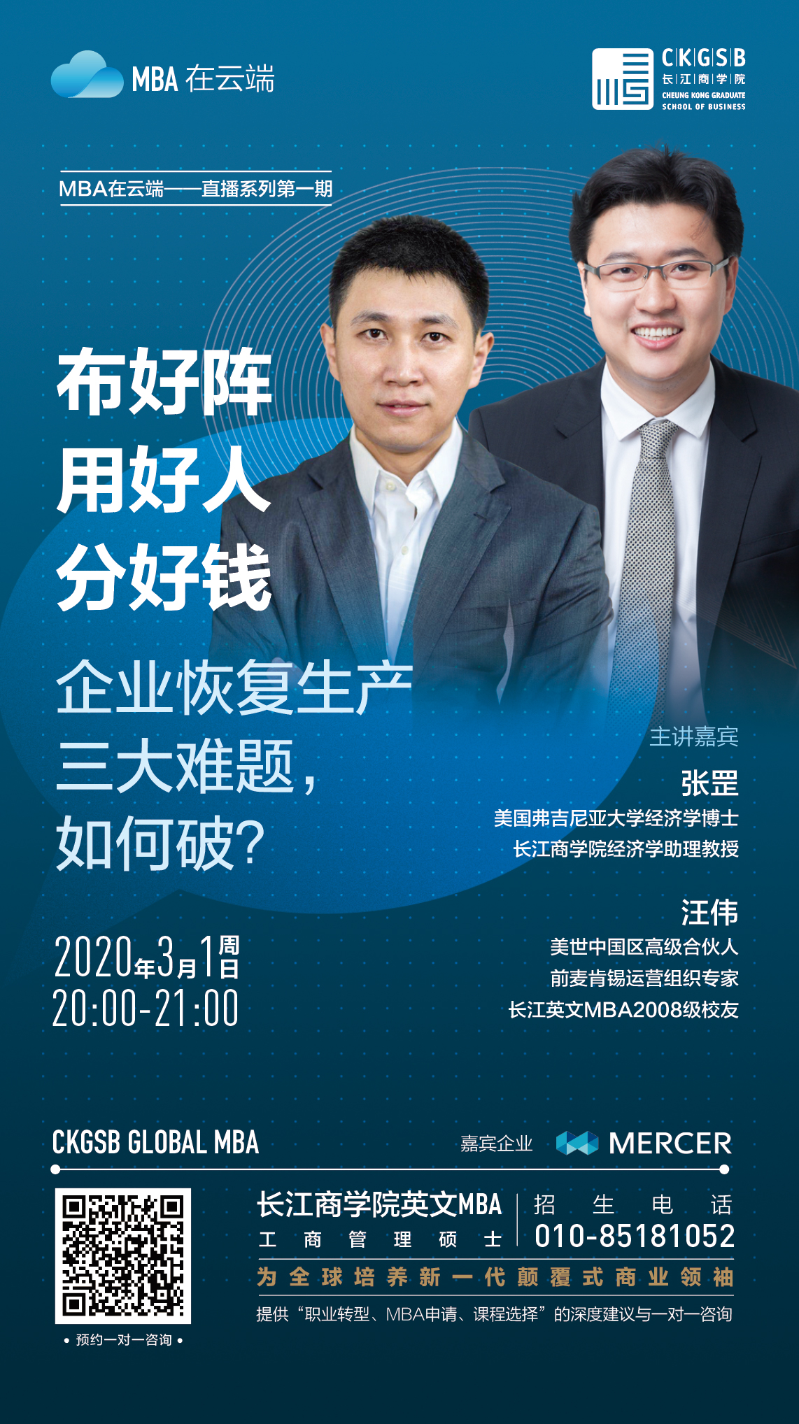 面对这一情势,长江商学院英文MBA项目践行使命与担当,特别推出“MBA在云端”系列直播分享,邀请长江教授和MBA菁英校友,将特殊时期提供给MBA学员及校友的实用知识与实践经验分享给每一位企业家、创业者和为企业发展建言献策的你。