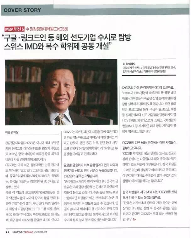 韩国权威商业周刊,Economy Chosun,在今年8月刊封面文章“全球MBA项目的危机”中列出了全球顶级商学院MBA TOP10,长江商学院MBA项目成为中华地区唯一上榜院校。