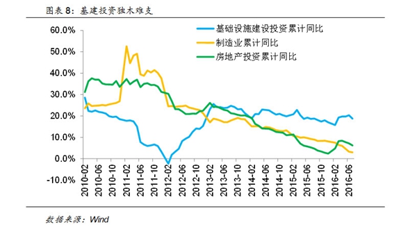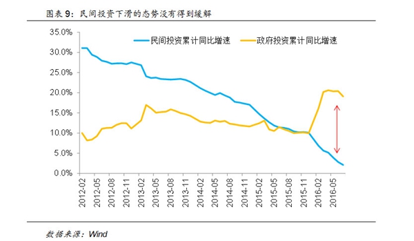 但基建投资未来的后续增长难以持续,主要原因在于民间投资并没有跟上。2016年以来,民间投资下滑的态势并没有缓解,尤其是5月份开始呈现加速下滑的态势,从此前的5%以上下滑到7月的2.1%。导致虽然年初以来政府财政投入呈现高速增长,特别是3月以来,一直维持在20%以上的同比增速,但整体的FAI增速仍然不断下滑。