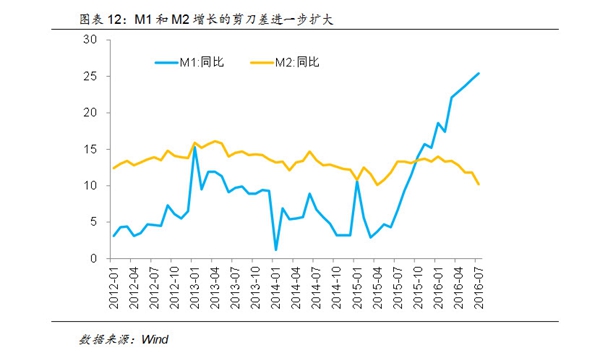 PPP的方式可能行之有效的一个原因在于能够调动民间资金的投资热情,事实上,实体企业并不缺乏流动性,目前来看,企业只是把多余的资金以定期存款的方式闲置在账面上,可以通过一个指标来考察这一现象,M1和M2的差额主要是居民的储蓄存款和企业定期存款,二者的剪刀差在2015年的下半年开始增长,目前仍在扩大。