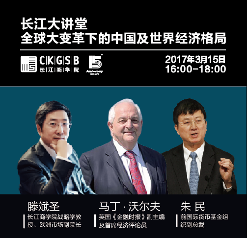 3月15日,英国《金融时报》全球副主编、首席经济评论员马丁·沃尔夫,前国际货币基金组织副总裁朱民走进“长江大讲堂”,和长江商学院战略学教授滕斌圣,共同探讨“全球大变革下的中国及世界经济格局”。