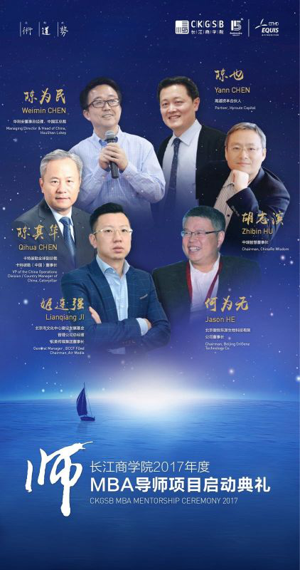 今年共有18位商界成功人士担任2017级MBA导师。他们是:卡特彼勒全球副总裁、卡特彼勒(中国)董事长陈其华,华利安董事总经理、中国区总裁陈为民(EMBA),高道资本合伙人陈也(EMBA), 北京傲锐东源生物科技董事长何为无,中瑞智慧董事长胡志滨(CEO),北京市文化中心建设发展基金总经理、航美传媒集团董事长姬连强(EMBA),马凯资本创始人、CEO李震,黑弧奥美创始人、董事长、总裁刘萨莎,触景无限创始人、CEO陆凡(EMBA),真爱梦想公益基金会创始人、理事长潘江雪,高维资本创始合伙人孙刚(DBA),瑞瀛湖资本创始人兼董事长田宇飚(EMBA),华软资本董事长王广宇(DBA),拉勾网创始人、董事长许单单,尼尔森大中华区总裁严璇佳酿中国创始人、CEO袁疆(EMBA),云锋基金董事总经理朱艺恺(EMBA), 斯道拉恩索公司中国区总裁宋望球等。