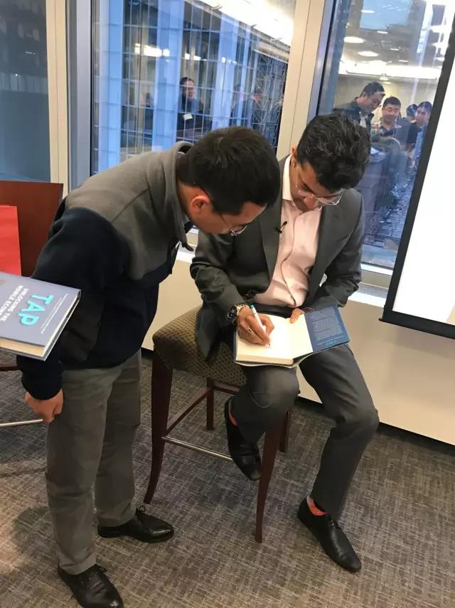 图为Anindya Ghose为同学在他的新书Tap:Unlocking the Mobile Economy上签名留念。