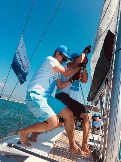 在出发时,队长给每一位成员分配帆船航海瞭望手、舵手、压舷等角色,充分调动整个团队的积极性,发挥成员最大潜能,合作前行。在此次的专业帆船知识学习中,同学们也学会了如何升帆,判断风向,转弯,在大海中迎风破浪,扬帆起航!