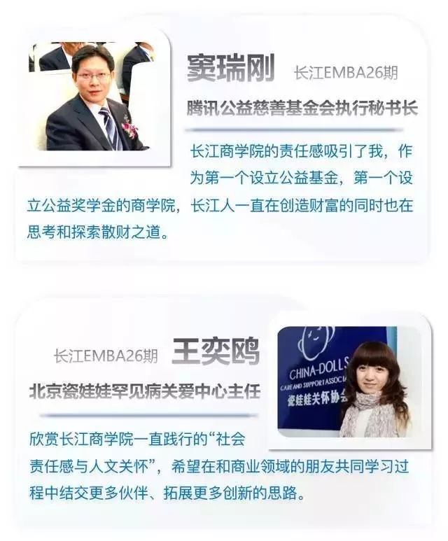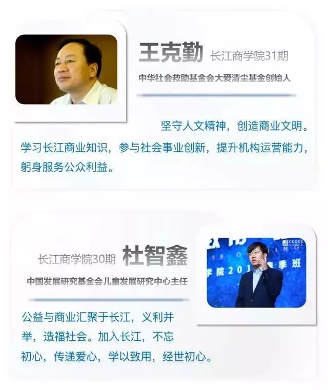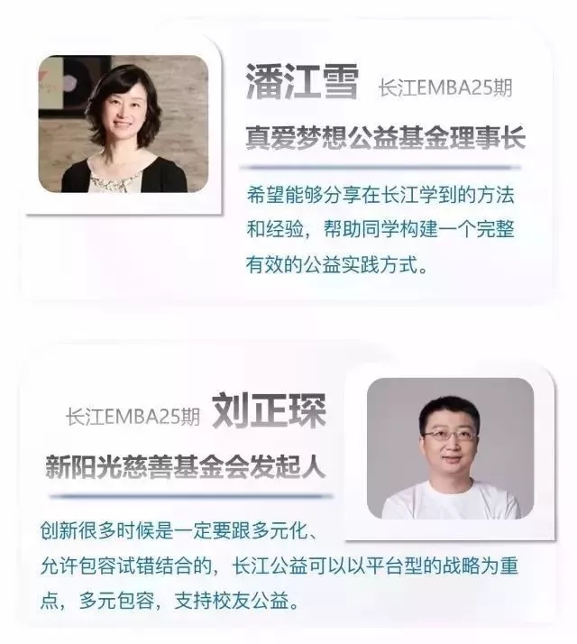 自2002年建院起,长江商学院始终将激发和培养学员的人文关怀和社会担当精神作为学院发展的重要使命。我们举办的每一次公益活动,都希望在校友社群营造“无公益,不长江”的文化,使得公益成为每一位长江人的学习和生活方式。