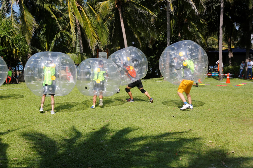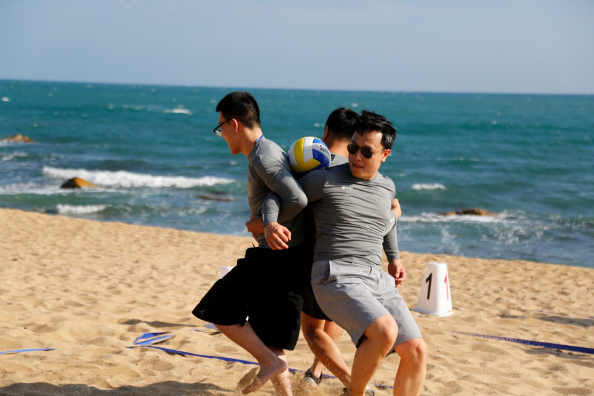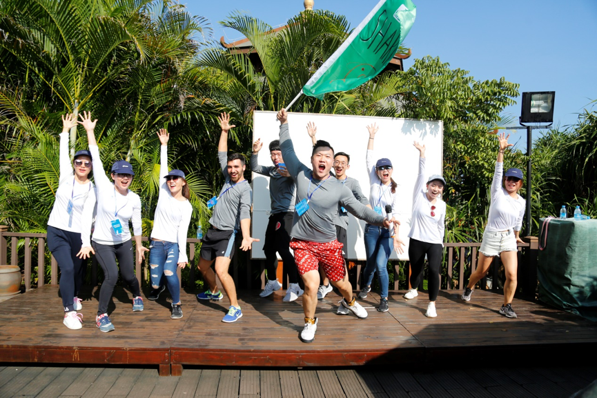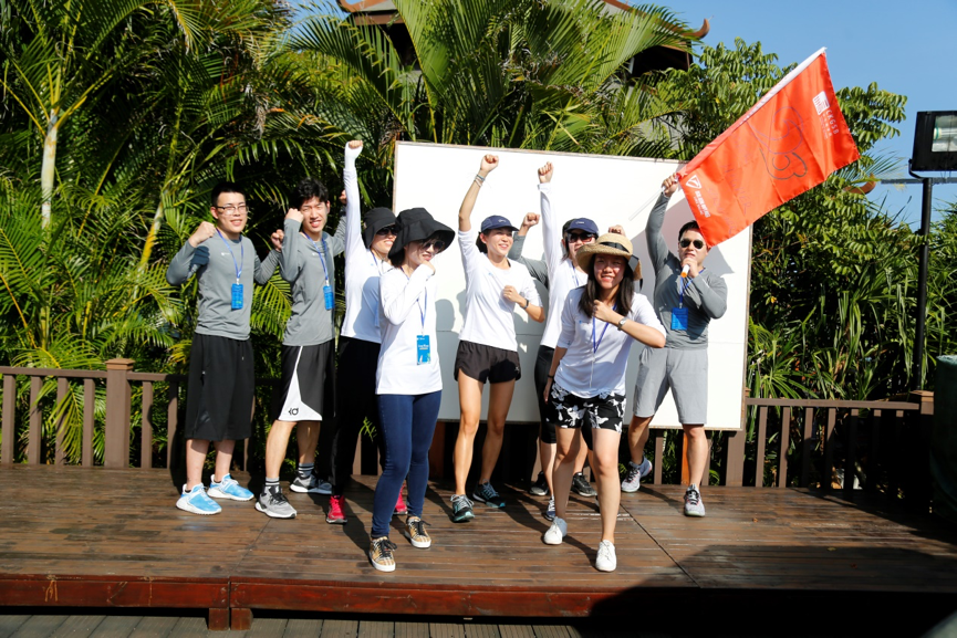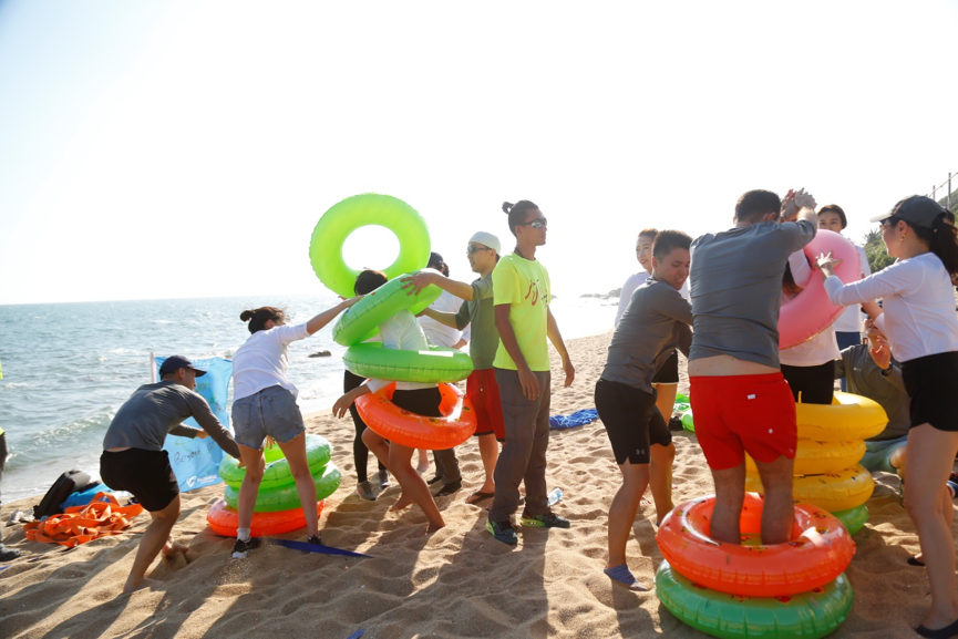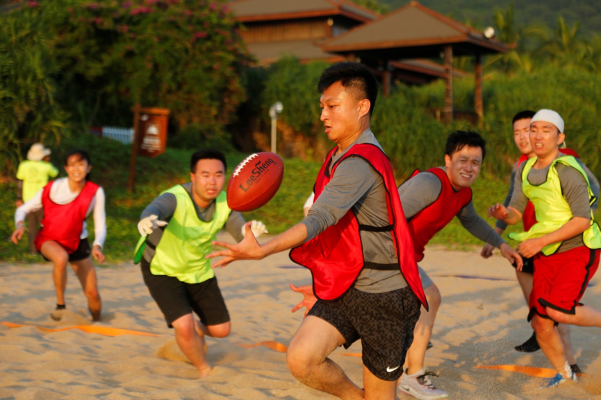 随后的3个小时,他们分为四队进行比赛,三人夹球跑、沙滩袋鼠跳、救生圈叠叠乐、椰子投篮机、沙滩橄榄球,每一项运动都需要全体成员投入百分之一百二十的努力,或上阵比赛,或场边呐喊,或出谋划策。如果帽子会被风吹跑,那就毅然的扔掉帽子,直面海岛阳光的挑战,如果鞋子会被沙子灌满,那就决然的脱掉鞋子,赤着脚在沙滩上全力奔跑,如果墨镜会影响比赛的发挥,那就果断摘掉墨镜,迎着耀眼的阳光向着团队的荣耀进发!