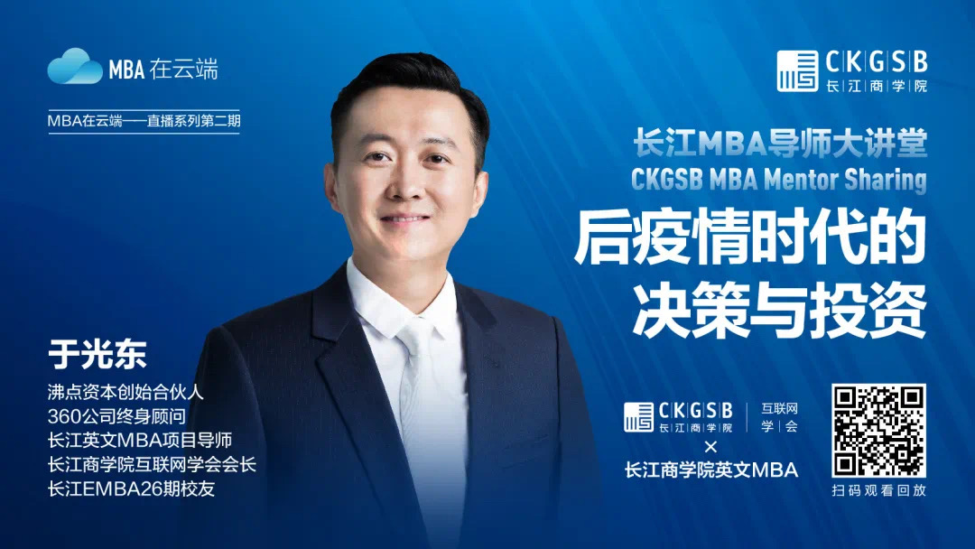 特殊时期,长江商学院英文MBA项目践行使命与担当,特别推出“MBA在云端”系列直播分享本期,长江商学院英文MBA项目携手长江商学院互联网学会,邀请沸点资本创始合伙人、长江商学院互联网学会会长、长江商学院英文MBA项目导师、长江EMBA26期校友于光东为大家带来了“后疫情时代的决策与投资”主题直播分享。长江英文MBA项目2019级、于光东导师指导学生王亚娜担任本次直播分享主持人。