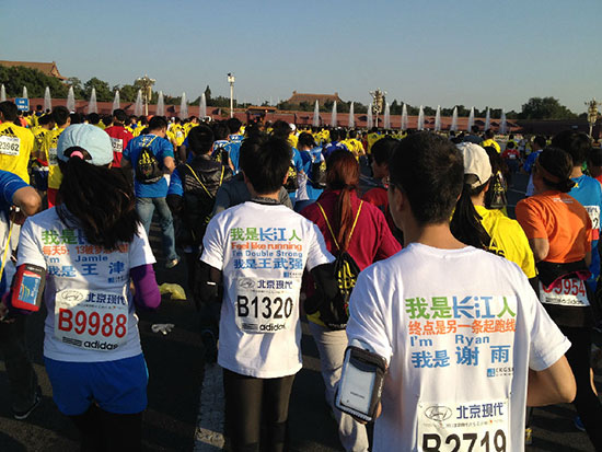 放出这等柔情狠话的就是刚参加完北京马拉松大赛的2013级MBA。自制限量版拉风T-shirt + 扛着长江标志蓝色大旗,一路超越若干兄弟院校的友人们,直抵终点!......