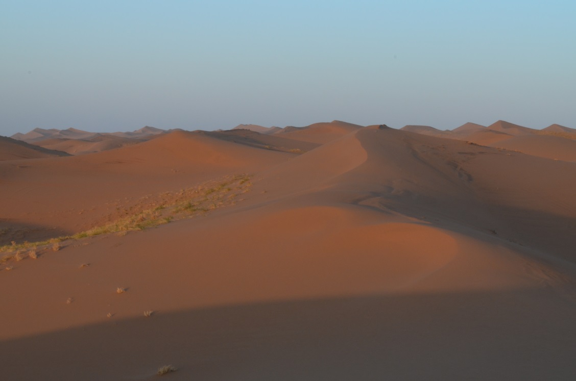 而自然,伟大的自然,也在我们面前慢慢地脱去了她温柔的面纱,用9级大风,卷起漫天黄沙,为我们来个一场盛大的欢迎仪式,开始身与心的洗礼。在北京时,遇到初春沙尘天气总是觉得烦恼,这时一对比,城市中的风沙温柔的不像话,腾格里的风沙才真正够味道。 当每次费劲力气,走两步退一步的踉踉跄跄的爬上坡顶,总觉得大风瞬间就能把自己吹下去,百十来斤的身体在坡顶迎风摇摆,让人不禁从心底生出对自然畏惧。
