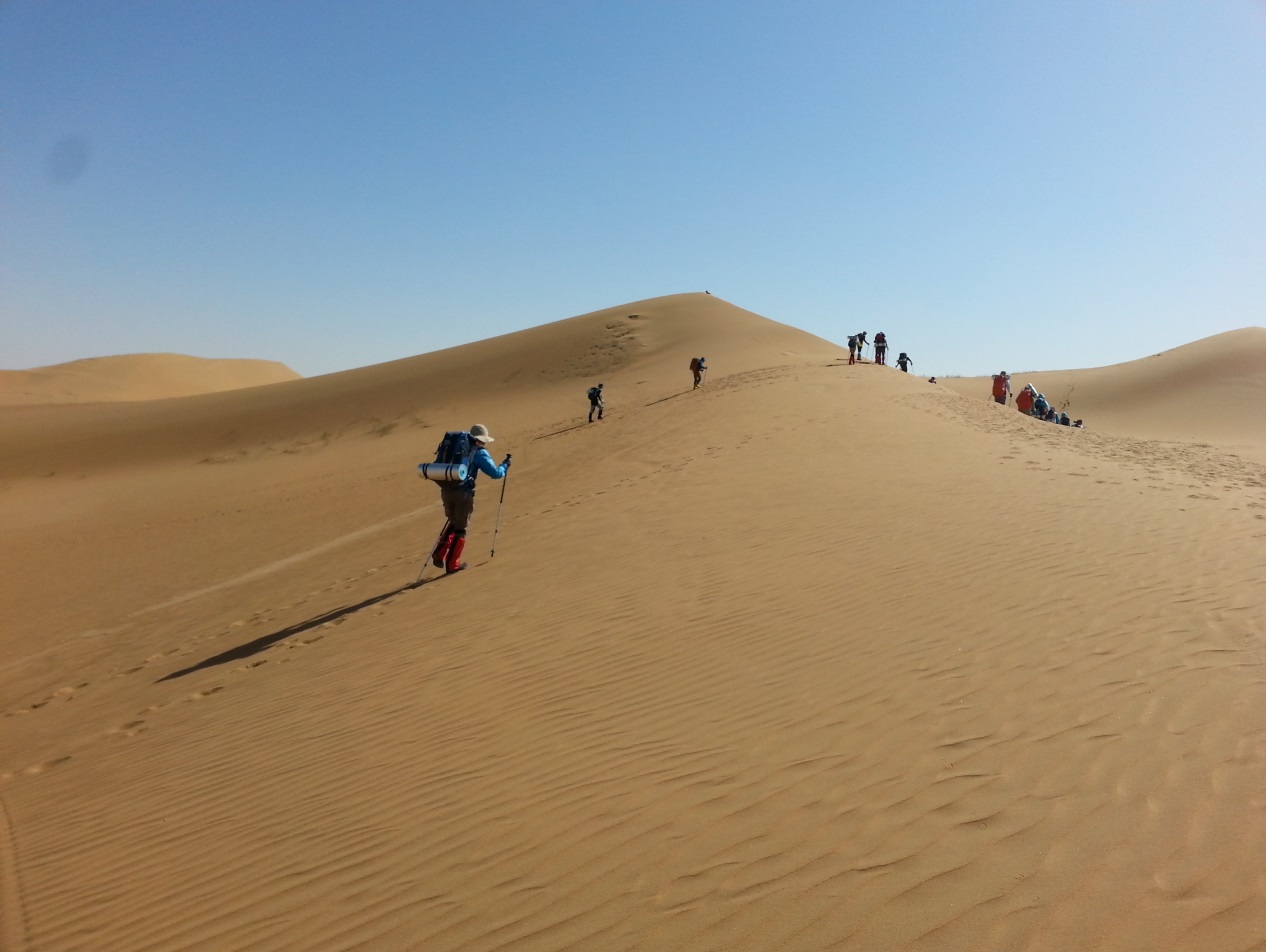 在沙漠中,终于体会到了人在自然界中是多麽的渺小。500多人的队伍,出发时声势浩大,但逐渐散落在浩瀚的沙漠中,渺小的像是海洋中的一滴水,沙漠中的一粒砂,沧海一粟。经常在走下一个沙坡时,前不见同伴,后不见队友,有的只是四周蔓延无际的黄沙和耳边呼啸不止的大风。沙尘迎面扑来,开始时还会不断擦脸,整理,慢慢地,也就习惯了这风沙的洗礼,有的只是浩大天地间渺小的自己,手中的双杖,肩上的背包,以及最最重要的,来自胸前别着的对讲机里队友间相互鼓励、打气的话语!这是一种怎样的心情呢?心中不再琢磨着工作的琐事,抛开了沉重的课业、未写完的论文,一种原始的求生存,求胜利的信念就这样简简单单的在沙漠中扎根!这支来自各大商学院的精英队伍,脱去了日常工作学习中的精英范,变得平实、简单而质朴。