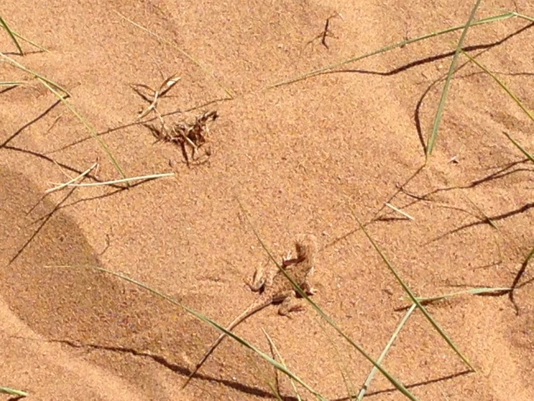 在沙漠中,我们终于体会到了水与食物的珍贵。漫无边际的黄沙中只要有一点绿色就让人觉得无限欣喜,无穷生机。偶尔看到一两只四脚蛇,忍不住感叹,这小小的生物却有着怎样强大的生命力!