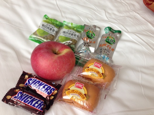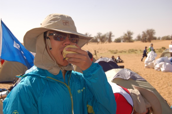 一路暴晒加风沙,人很容易脱水,有限的水资源无比珍贵,根本不舍得浪费,用来洗手洗脸更是想也别想的奢侈。每天的午餐也是在徒步途中匆匆了事,组委会发的口粮袋,两个小面包,一个苹果,再加上士力架和牛肉干就是徒步一天的午餐。迎风就沙,别有一番滋味。只有参加了亚沙赛才知道,水果是这样的美味,一天的暴晒后咬一口多汁的脆梨,甜蜜的汁水一下子就流到了心底,每一口都是满满幸福!