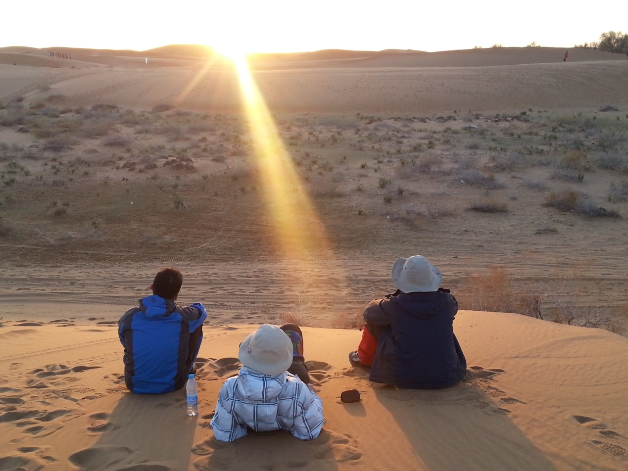 每当傍晚降临,一缕余晖是对一天艰苦跋涉的最好回馈。图中三位伪文青从左至右分别是Charles、Xiaoxin和HTC。他们结束了25公里的行程,相约在沙漠中难得没有风沙的傍晚依偎在一起,享受这独一无二的日落。家在双井桥西的Xiaoxin,多年来仍然固守着欣赏流行音乐的传统,在他看来,身旁那黑色的蓝牙音箱是这日落美景的最佳伴侣。伴着一曲《光辉岁月》,三个人若有所思的眺望远方,仿佛生命中充满了希望……