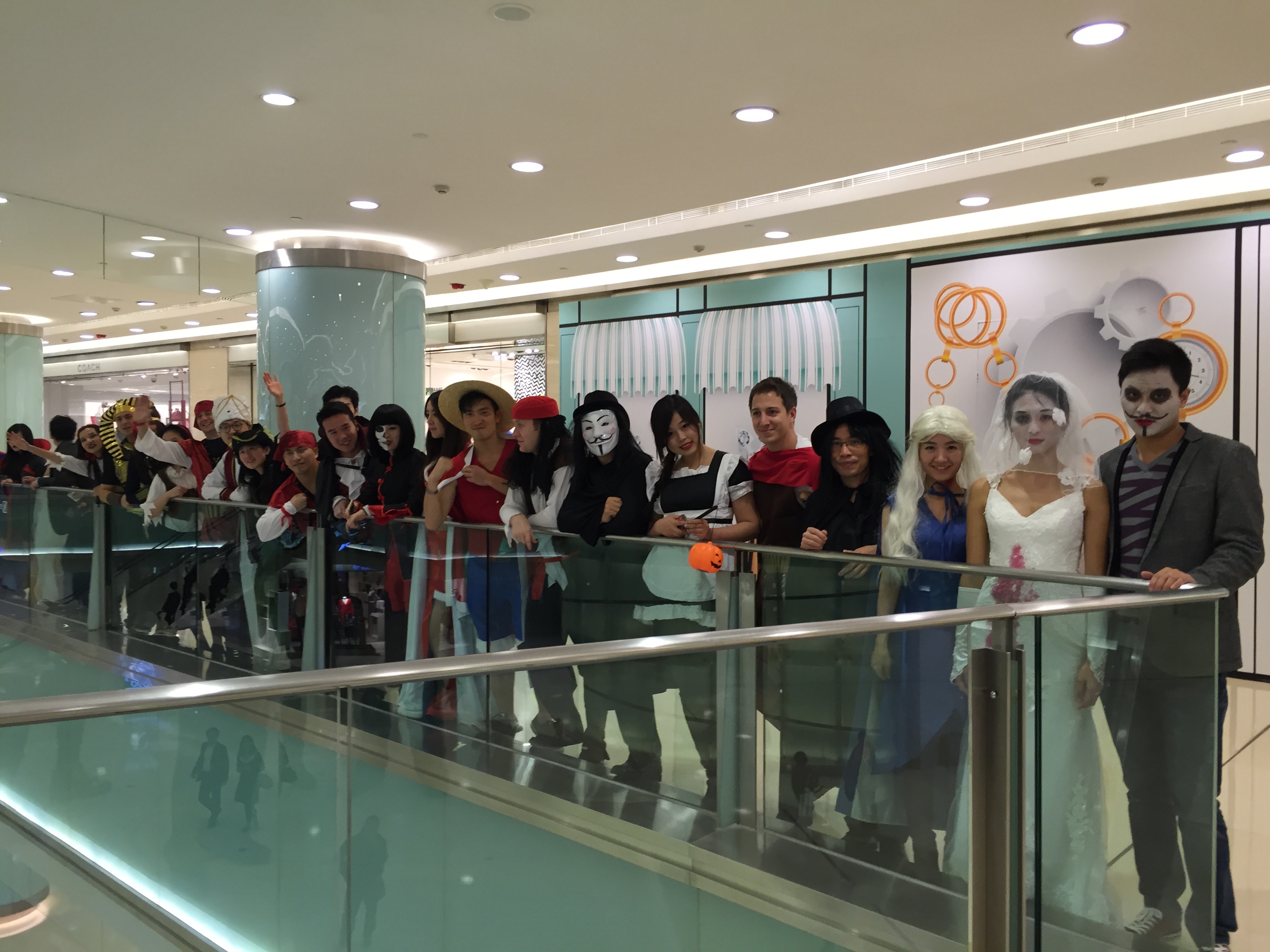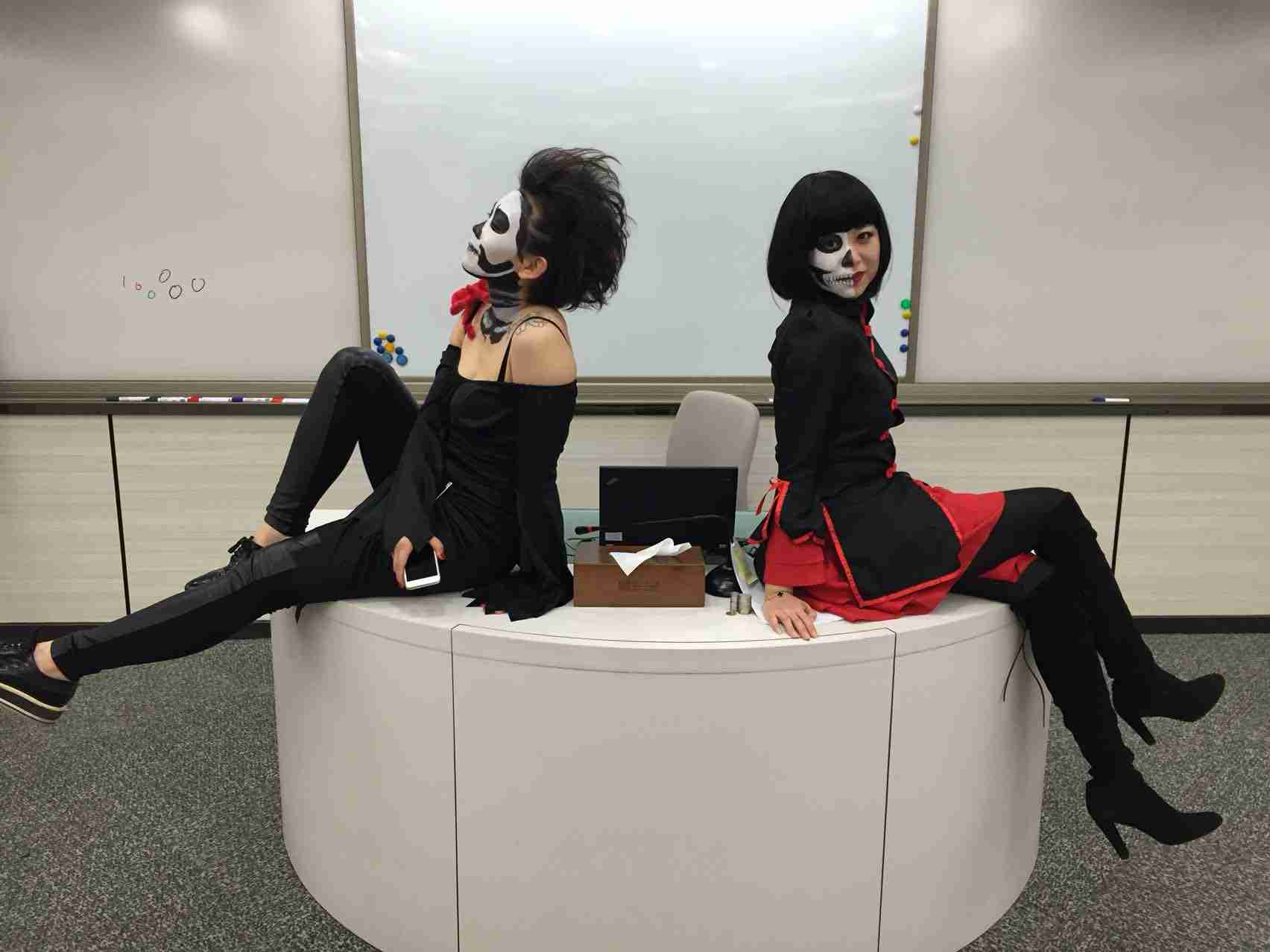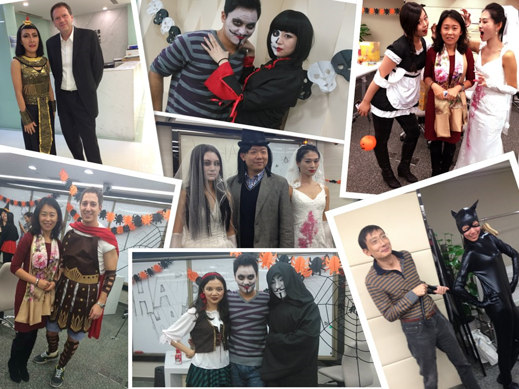 平时幽默可亲的新东方名师Johnny被饰成令人可憎的恶魔;美丽乖巧的Nina和小曼化身僵尸和嗜血女郎 --“豁得出去的女孩子才叫真可怕哦~~”我们发在微信好友圈的照片,被一浪高过一浪的转发潮席卷,互动的讯息通过光缆从世界各地脉冲而来……教授和老师们也加入我们,一起摆拍合影,玩在一起,构成长江大家庭最快乐的写真。